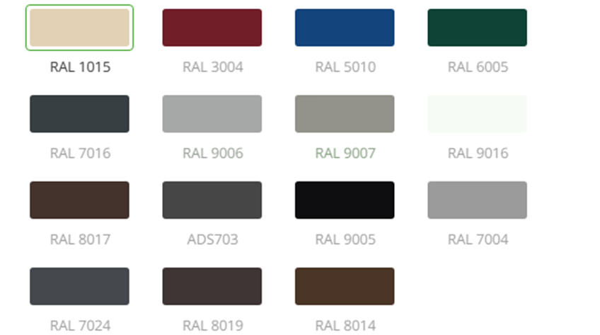 RAL 9002 (базовый); RAL 9006, RAL 9016, RAL 7024 (по спеццене); и еще более 200 цветов по каталогу RAL